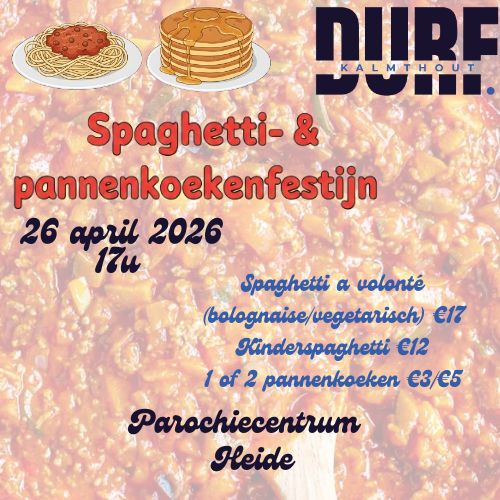 Op zondag 26 april organiseren we een gezellig spaghetti- en pannenkoekenfestijn in de zaal van 't Centrum (Heidestatieplein 8). Vanaf 17u ben je van harte welkom om te genieten van een heerlijke maaltijd en goed gezelschap.